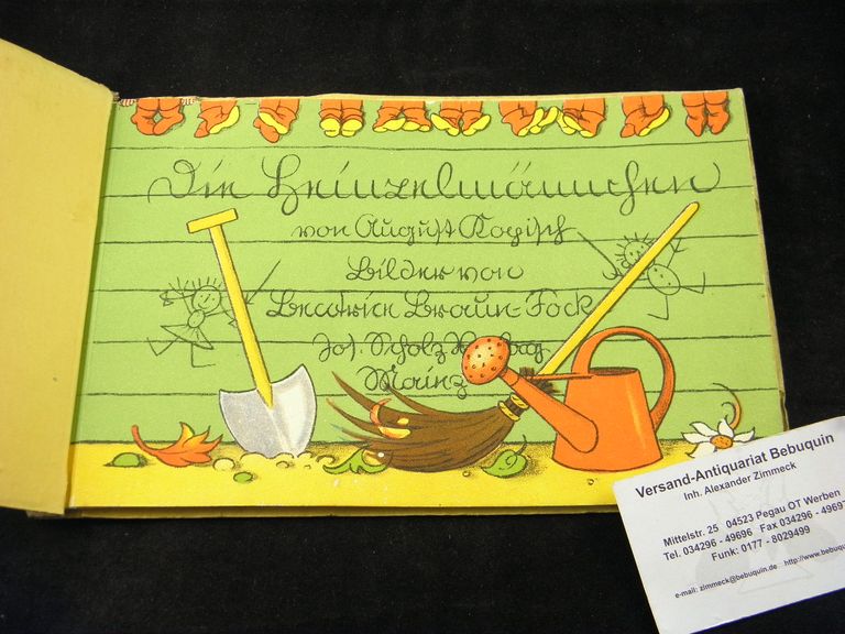 KOPISCH, August: Die Heinzelmännchen. Mainz (Jos. Scholz), ca 1940. Quer 4°. 10 Bl. mit 10 farb. Bildtafeln (incl. Titeltafel) und 10 Textabb. farb. ill. OHLn. Einband stärker bestaubt, etwas verzogen und an den Rändern berieben, innen nur am Ende etwas fingerspurig. Absolut seltene Ausgabe ohne die ausgestanzten Heinzelmännchenköpfe am oberen Rand. In meinen Bibliographien nicht zu finden.