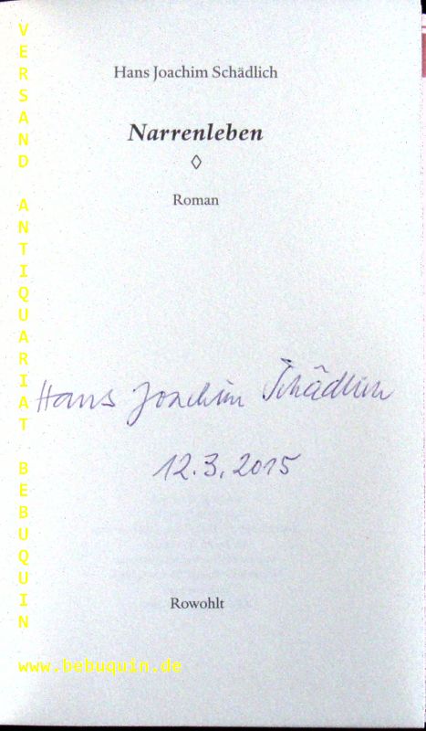 SCHÄDLICH, Hans Joachim: Narrenleben. Roman. Reinbek (Rowohlt), 2015. 174 S. OPb mit OUmschl. tadellos. EA mit der eigenhändigen datierten Signatur des Dichters auf Titelseite