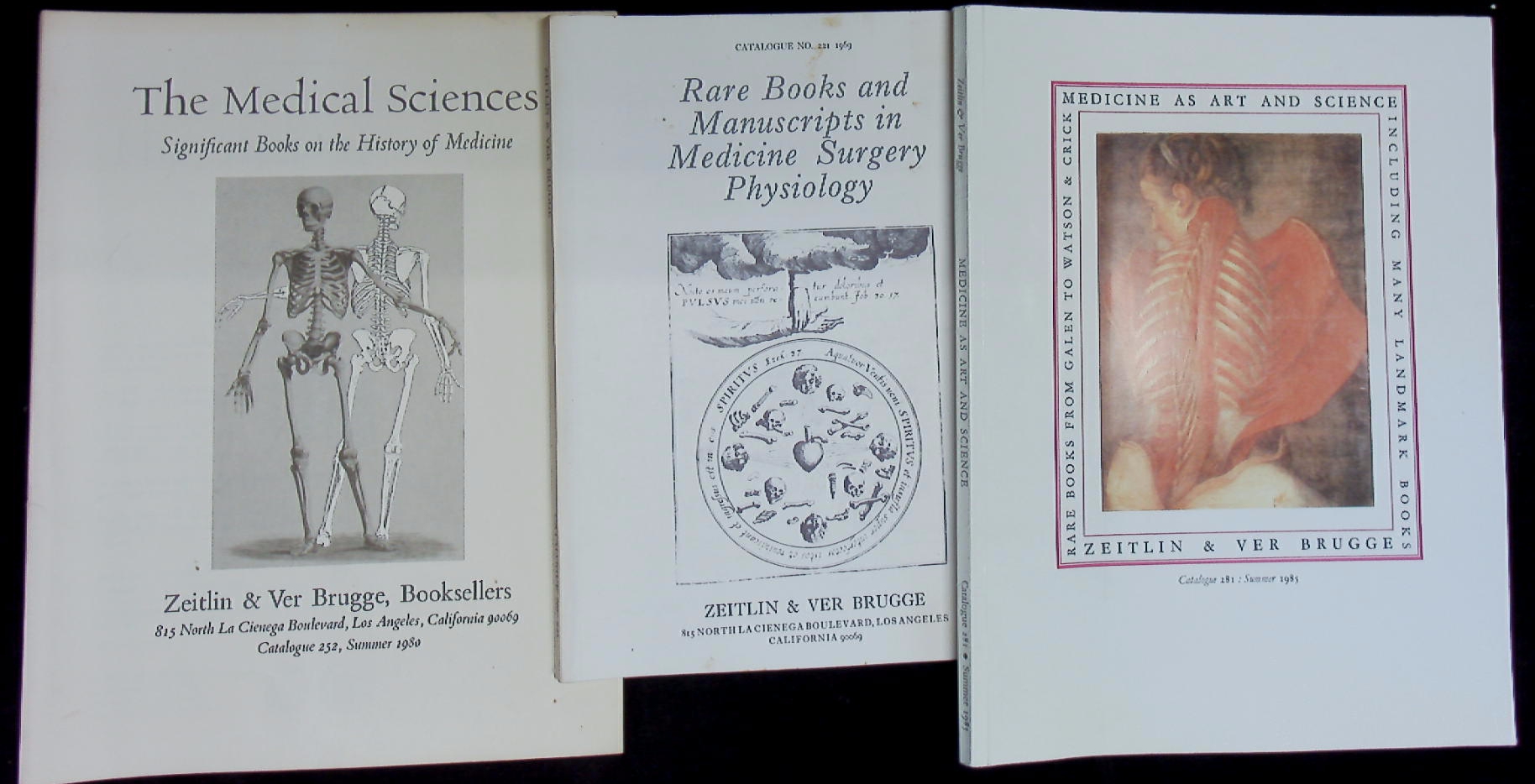KATALOGE.– ZEITLIN & VER BRUGGE: 13 Antiquariatskataloge: Nr. 170, 182, 216, 221, 233, 238, 240, 245, 252, 260, 270, 281, 288 Rare Books in The Medical Sciences. 13 Bände. Los Angeles (Zeitlin & Ver Brugge) 1955 – 1986. 8°, Gr. 8° + 4°. jeweils zwischen 50 und 150 S. mit zahlr. Abb. ill. OKart. leichte Gebrauchsspuren. Interessantes Lot der berühmten amerikanischen Katalogreihe.