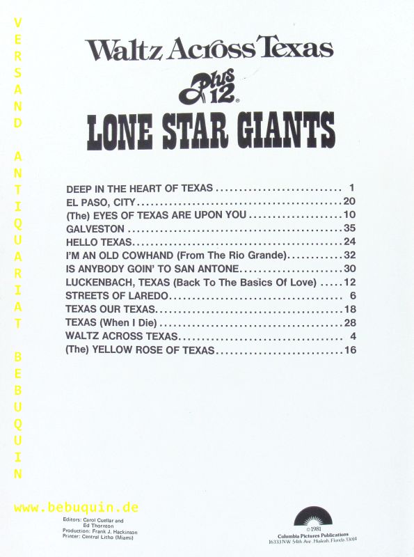 SONGBOOKS.– WALTZ ACROSS TEXAS.– Plus 12 Lone Star Giants. Miami (Columbia), 1981. 4°. 37 S. mit Noten. ill. OKart. gutes Ex. EA.