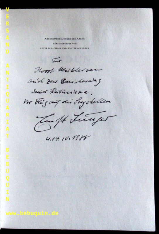 JÜNGER, Ernst: Myrdun. Briefe aus Norwegen. Zürich (Arche), 1948. 4°. 77 (2) S. mit zahlr. Abb. nach Zeichnungen von Alfred Kubin. OBr. eine Ecke gering bestoßen, sonst feines Ex. = Argonauten-Drucke der Arche. Nr. 772 von 1000 Ex. dieser Ausgabe mit einer 6zeiligen eigenhändigen datierten und voll signierten Widmung an Horst Mühleisen: „(…) auch zur Bereicherung seiner Kubiniana. Vor Flug auf die Seychellen″ auf dem Vortitel.