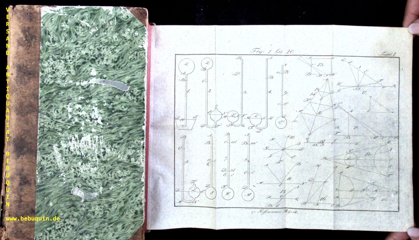 JAGD.– HOFFMANN, Johann Josef Ignaz: Physik und Mechanik für angehende und ausübende Forstmänner, Kameralisten und Oekonomen. 2 Bände in 1 Bd. Gotha (Hennings), 1824. XIV, 354 (4) S. + 11 gefalteten Kupfertafeln sowie VIII, 351 S. + 10 gefalteten Kupfertafeln und dreiseitigem Rotschnitt. HLdr der Zeit mit goldgeprägten Rücken Kanten berieben und teils eingerissen, innen gut. = Die Forst- und Jagdwissenschaft nach allen ihren Theilen für angehende und ausübende Forstmänner und Jäger, 8 Theil. EA. Johann Josef Ignaz Hoffmann, ab 1856 von Hoffmann, (* 17. März 1777 in Mainz; † 30. Januar 1866 in Aschaffenburg) war ein deutscher Mathematiker. (Wikipedia)