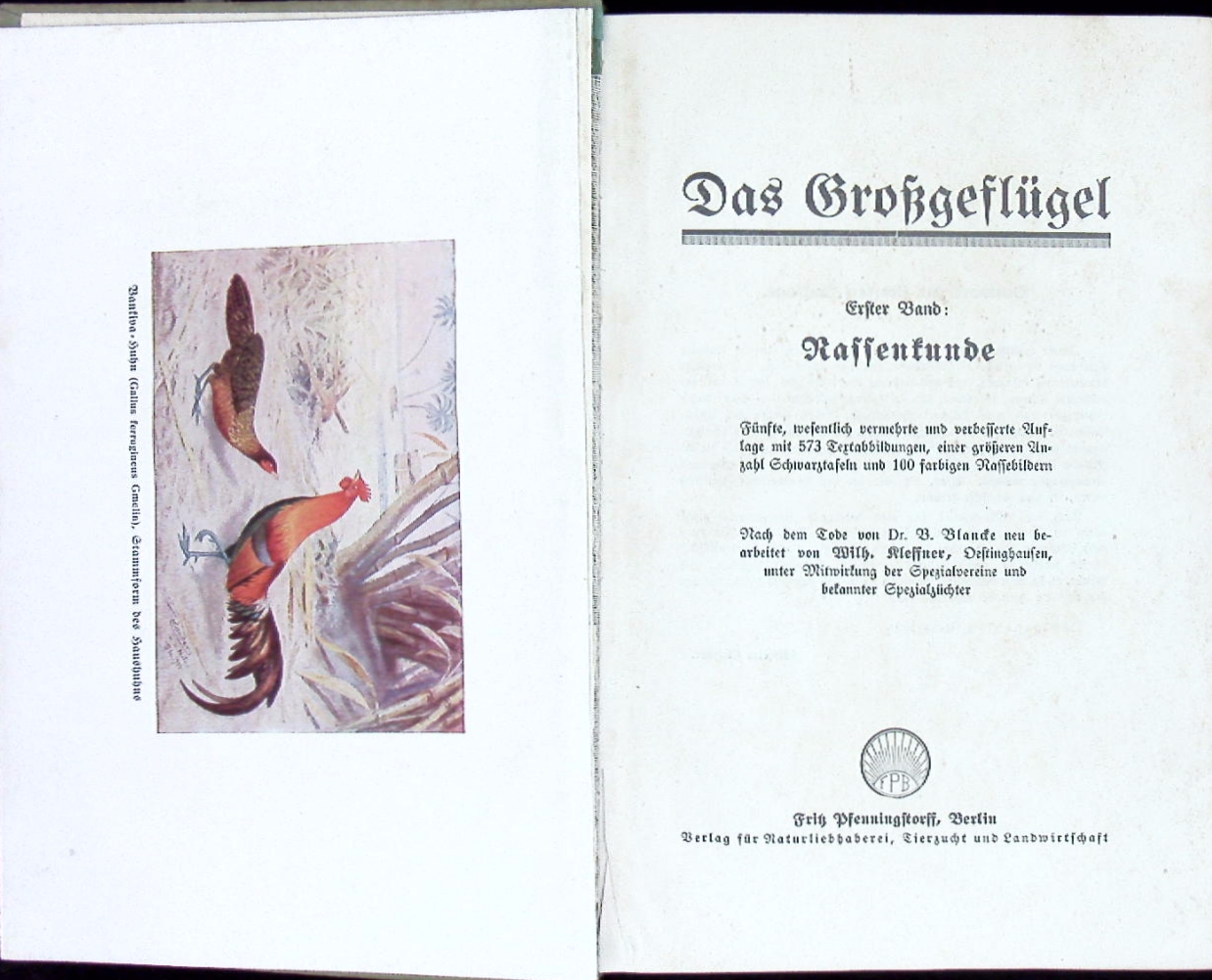ORNITHOLOGIE.– BLANCKE, B. + KLEFFNER, Wilhelm: Das Großgeflügel. 1. Band: Rassenkunde + 2. Band: Haltung, Pflege, Zucht und Verwertung des Geflügels. 5. wesentlich vermehrte und verbesserte Aufl. 2 Bände in 1 Bd. Berlin (Pfennigstorff), 1925. Gr. 8°. VI, 624 S. mit 573 Textabb., einer großen Anzahl von Rassebildern + 100 farb. Bildtafeln; VIII, 624 S. mit 538 Textabb., zahlr. scharzen und 6 farb. Bildtafeln. OLn. Rücken etwas geblichen, vorderes Gelenk gelockert, sonst sehr feines Ex. Ein ausführliches Handbuch über Zucht, Haltung und Pflege unseres Hausgeflügels. Hier in der raren gesuchten stark erweiterten Ausgabe.