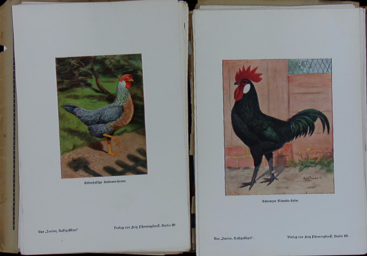 ORNITHOLOGIE.– ZANDER, Kurt: Rassegeflügel. Eine Sammlung von Standardbildern nach Aquarellen. Berlin (Pfenningstorff). (1910). Gr. 8°. 167 farb. Bilder lose in 3 Lieferungsumschlägen (so komplett). farb. ill. OHLn Mappe. Mappe an den Kanten berieben, die Lieferungsumschläge teils nur fragmentarisch erhalten, die Bilder selbst nur sehr vereinzelt leicht gebräunt. EA Nissen I, 442.