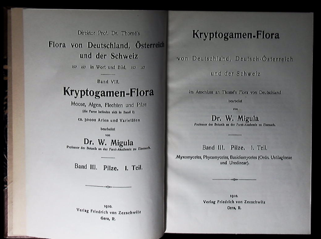 PILZE.– MIGULA, W.: Krytogamen-Flora von Deutschland, Deutsch-Österreich und der Schweiz in Anschluss an Thomé’s Flora von Deutschland. Band 3: Pilze, 1. Teil (Myxomycetes, Phycomycetes, Basidiomycetes (Ordn. Ustilagineae und Uredineae), 2. Teil (in zwei Bänden) (Basidiomycetes) und 3: Teil: Ascomycetes (in zwei Bänden) 1.Abt: (Hemiasci, Saccharomycetineae, Protodiscineae,Plectascineae, Pyrenomycetes (Perisporiales und Sphaeriales), 2. Abt.: Dothideales, Hypocreales, Hysteriales, Discomycetes, Laboulbeniaceae. 4. Teil, 1. Abt.: Fungi imperfecti: Sphaeropsidales, Melanconiales. 4. Teil in 6 Bänden. Gera, (Friedrich von Zezschwitz), 1910 – 1921. 510, 814 S. mit 146 Tafeln; 1404 S. mit 200 Tafeln, 614 S. mit zahlr. lithogr. Bildtafeln. OHLn mit jeweils 2 goldgeprägten farb. Rückenschildern. Rückenschildern gering berieben, sonst sehr gute Erhaltung, es fehlt die 2. Abt. des 4. Teils, die erst 15 Jahre später erschien. = Thomes Flora von Deutschland, Österreich und der Schweiz in Wort und Bild. EA.