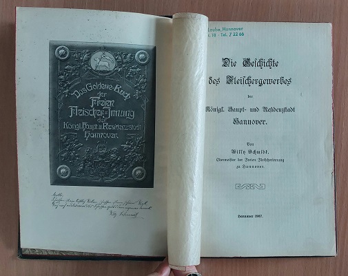 HANNOVER.– SCHMIDT, Willy: Die Geschichte des Fleischergewerbes der Königl. Haupt- und Residenzstadt Hannover. Hannover, 1907. 198 S. mit 4 Bildtafeln mit Seidenpapierschutz. OLn. Kanten leicht berieben, Ex libris der Alten Mühle. EA.