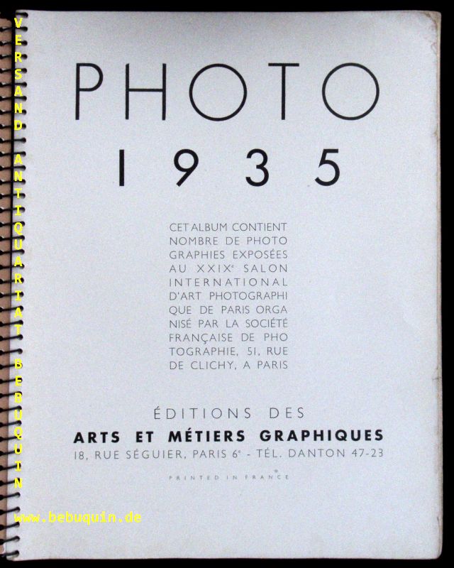PHOTO 1935.– Cet Album Contient Nombre de Photographies exposées au XXIXe Salon International D’Art Photographique de Paris organisé par la Société Francaise de Photographie, 51 rue de Chlichy, a Paris. Paris (Arts et Métiers Graphiques), 1935. 4°. 6 Bl., 127 (1) Seiten. Mit 120 meist ganzseitigen Fototafeln (1 farbig) in Kupfertiefdruck. farb. illl. OKart in Ringbuchbindung. Ecken leicht berieben, die Referendum-Seite etwas gelockert, NaV EA. Wichtiges Schaufenster der internationalen Foto-Avantgarde, mit Beiträgen international renommierter Fotografen, in hervorragender Druckqualität, vergleichbar mit „Das Deutsche Lichtbild“. Das vorliegende Heft enthält Aufnahmen von Margaret Bourke-White, Bill Brandt, Marianne Breslauer, Hein Gorny, Florence Henri, Ewald Hoinkis, H. P. Horst, Herbert List, Martin Munkacsi, George Platt-Lynes, Willy Prager, Ringl, Andre Steiner, Otto Umbehr (Umbo), Pierre Verger, Edward Weston, Paul Wolff, u.v.a. – (Koetzle S. 48/49. Koelzer 18760)
