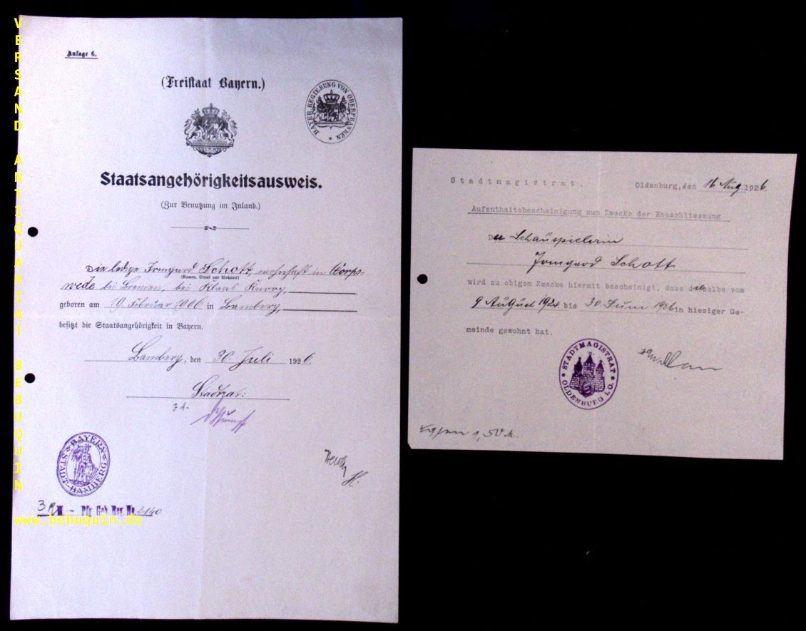 WORPSWEDE.– SCHIESTL, Albert Ludwig Georg: eigenhändig signierte persönliche Urkunden. I. Handschriftlich ausgefülltes Formular des Personalausweises mit Foto vom 6. März 1923. II. 4seitiges Aufgebotsverzeichnis vom 23. August 1926 des Malers Albert Ludwig Georg Schiestl und der Schauspielerin Irmgard Schott mit detailreichen biographischen Angaben und den eigenhändigen Unterschriften der beiden Eheleute. III. 3 Aufgebotsaushänge vom 25.– 30. August 1926 in Lilienthal, Worpswede und Oldenburg mit den entsprechenden Stempeln und Signaturen. IV. Staatsangehörigkeitsausweis der Irmgard Schott aus Hamburg vom 30. Juli 1926 sowie deren Aufenthaltsbescheinigung zum Zwecke der Eheschließung vom 30. Juni 1926. Worpswede, 3.3.1901. unterschiedliche Formate. insgesamt 7 Papiere seitlich gelocht mit Faltspuren. Albert Schiestl wurde 1883 in Erding geboren. Sein Leben lang hatte und malte Albert Schiestl Hunde, denn „ohne Hund kann ich nicht leben“, meinte er. Nach einem gescheiterten Versuch, nach Amerika auszuwandern arbeitete er in Bremen zunächst als Dekorationsmaler, danach in einem Fotostudio. Dort lernte er seine spätere Ehefrau, die Kunstmalerin Annemarie Holländer kennen, 1913 kam Töchterchen Liselotte zur Welt. Nach dem Ersten Weltkrieg zog Albert Schiestl zu Ehefrau und Tochter nach Worpswede und genoss die Gesellschaft der berühmten Künstler der Kolonie. Allerdings nahm sein Leben eine traurige Wendung: Er trennte sich von seiner Frau, dann brannte seine Unterkunft in Worpswede beim sogenanneten Brunnenhofbrand ab, und er verlor alles, was er besaß. Er zog in den Harz, wo er sich mit Malen und Gelegenheitstätigkeiten über Wasser hielt. In unerträglicher Lage nahm er einen von Freunden arrangierten Aufenthalt in einem Nervensanatorium dankbar an. Gestärkt nahm er wieder an Ausstellungen teil und signierte seither mit dem Namen Albert Schiestl-Arding als Reminiszenz an seine Geburtsstadt. Er heiratete 1926 die Schauspielerin Irmgard Schott. Nach der Geburt von Tochter Nora erlebte er eine große Schaffenskraft. 1935 wurde Sohn Thomas geboren. Am 14. Februar 1937 starb Albert Schiestl-Arding; begraben ist er in Worpswede. (Wochenblatt)
