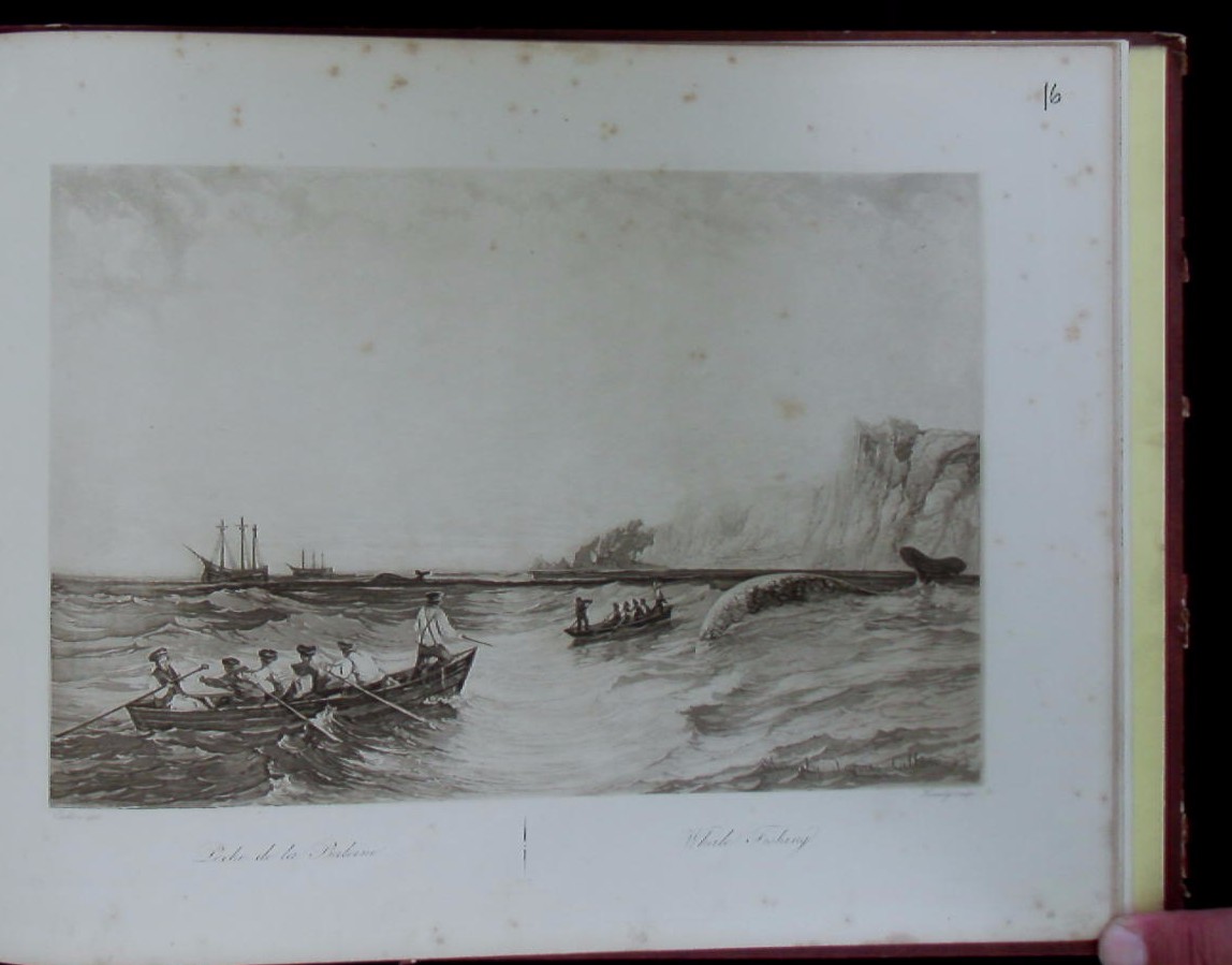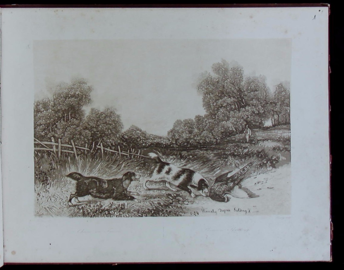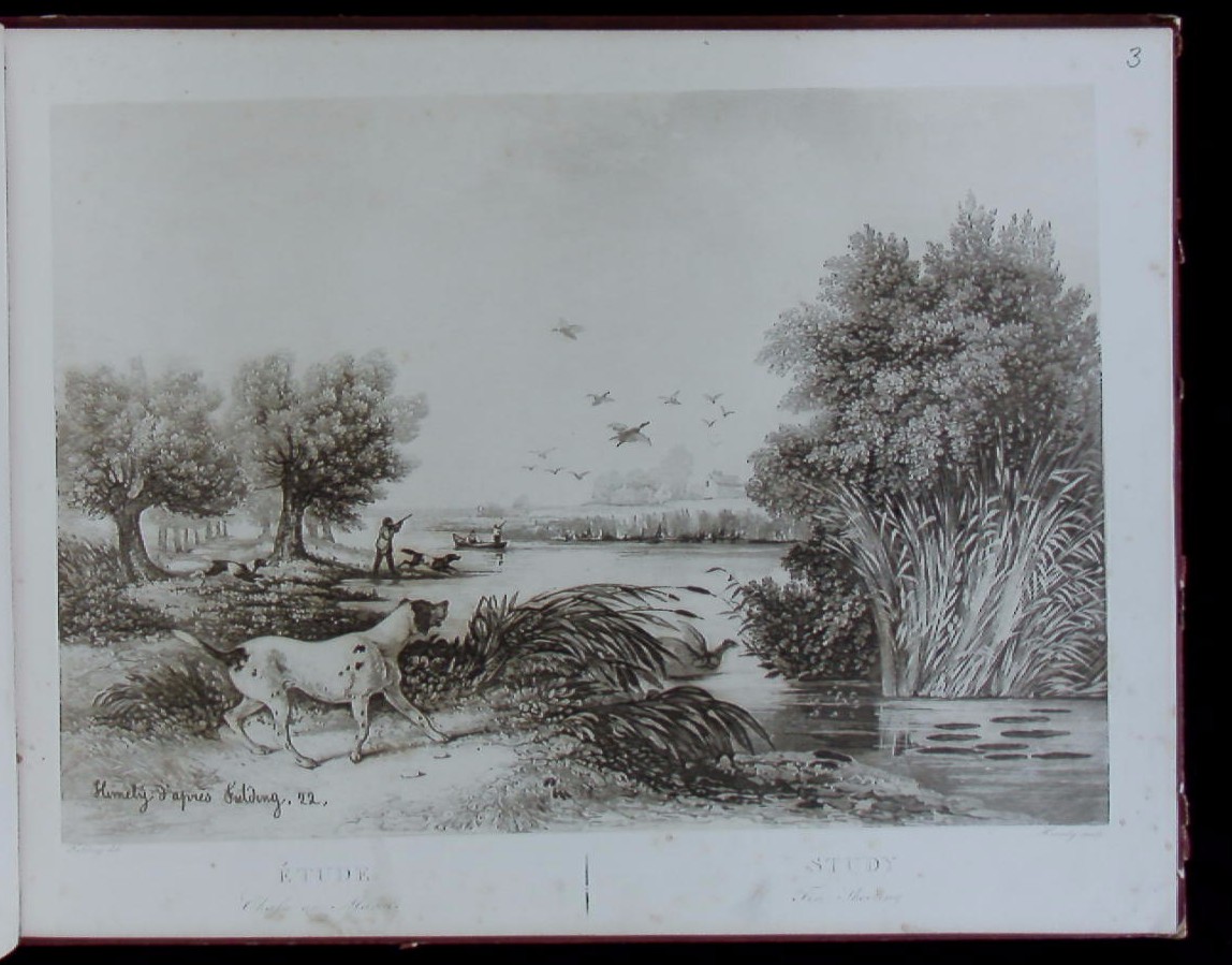 JAGD.– FIELDING (Newton) & CALLOW, John: Album de Chasse et Pêche (Deckeltitel). o.O. ca 1849. Quer 4°. 20 Aquatintatafeln entworfen von Callow u.a., gest. von Himely. OHLdr mit goldgeprägter Deckelvignette. Kanten etwas berieben und teils eingerissen, Blattränder teils etwas stockfleckig, eine Tafel mit kleinem Randeinriss, insgesamt ordentlich. EA der Seltenen Folge von schönen, bewegten Jagd- und Fischereiszenen. – Vgl. Thieme-B. V, 408 (W. Callow).
