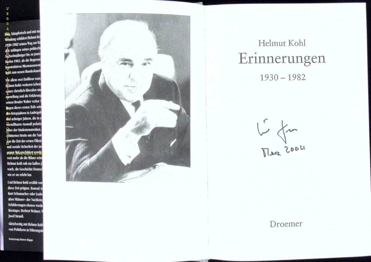KOHL, Helmut: Erinnerungen. 1930 – 1982. München (Droemer), 2004. 683 S. mit zahlr. Bildtafeln. OPb mit OUmschl. feines Ex. EA mit der eigenhändigen datierten Signatur des Verfassers auf Titelseite.