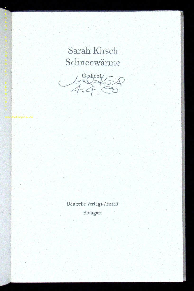 KIRSCH, Sarah: Schneewärme. Gedichte. Stuttgart (DVA). 1989. 74 (3) S. ill. OKart. feines Ex. EA WG² 35 mit der eigenhändigen datierten Signatur der Dichterin auf Titelseite.