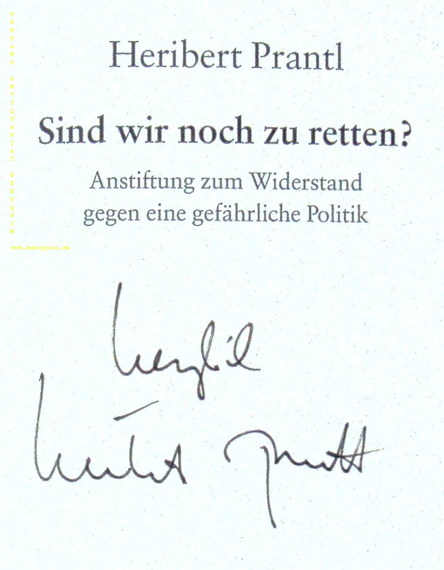 PRANTL, Heribert: Sind wir noch zu retten? Anstiftung zum Widerstand gegen eine gefährliche Politik. München (Hanser), 1998. 280 (6) S. OPb mit OUmschl. gutes Ex. Mit der eigenhändigen Signatur des Autors auf Titelseite.