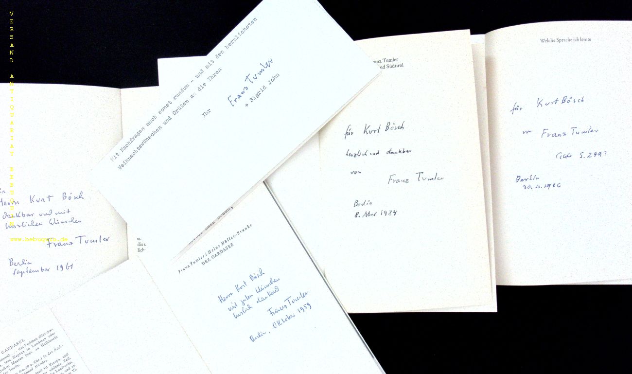 TUMLER, Franz: 4 Widmungsexemplare an Kurt Bösch und 1 Brief. 1. Welche Sprache ich lernte. 2. Das Land Südtirol. 3. Das Gardasee. 4. Über die Ladiner. 4 Bände. München u.a. (Piper u.a.), 1959 – 1986. zusammen ca 1000 S. OKart. gute Ex. Jeweils mit ausführlicher eigenhändiger und datierterWidmung an den Bibliophilen Kurt Bösch. Dabei ein einseitiger mascheinenschrifftlicher und eigenhändig signierter Brief an denselben mit persönlichen Nachrichten. Fünfteiliges Konvolut für zusammen