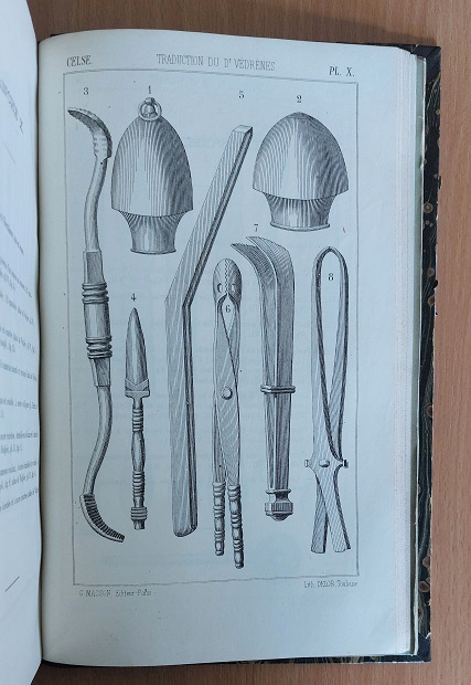 MEDIZIN.– CELSUS, Aulus Cornelius: Traite de Medecine de A. C. Celse. Traduction nouvelle, avec texte latin, notes, comentaires, tables explicatives. Franz. von Vedrenes. Paris (Masson), 1876. Gr. 8°. XII, 797 S. mit figures dans le texts et quatorze planches contenant 110 figures dínstrumentes de chirurgie antique. HLdr um 1900 mit goldgeprägtem Rücken. St.a.T., sonst gutes Ex. Franz. EA. Aulus Cornelius Celsus (fälschlich auch Aurelius Cornelius Celsus; * um 25 v. Chr.; † um 50 n. Chr.) war ein römischer Enzyklopädist und um 30 n. Chr. einer der bedeutendsten Medizinschriftsteller seiner Zeit. (Wikipedia)