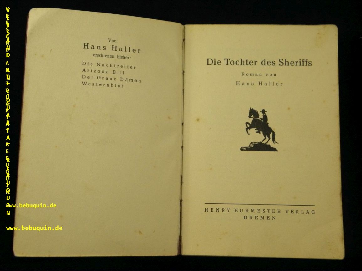 HALLER, Hans: Die Tochter des Sheriffs. Bremen (Burmester), (1933). 253 (3) S. schlichter InterimsKart. leicht schief gelesen und bestaubt. = Burmester’s Abenteuer – Serie. EA. Schegk / Wimmer S1.