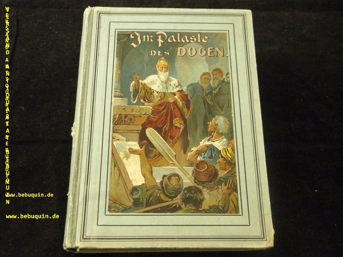 WIRTH, Max: (d.i. Andrä Heinrich Fogowitz) Im Palaste des Dogen. Eine Erzählung aus der Zeit von Venedigs Dogenherrschaft. Reutlingen (Bardtenschlager), (1899). 169 S. + 4 Farbtafeln. farb. ill. OHLn. Rücken mit kleiner Fehlstelle., StaT. EA. Wegehaupt 903.