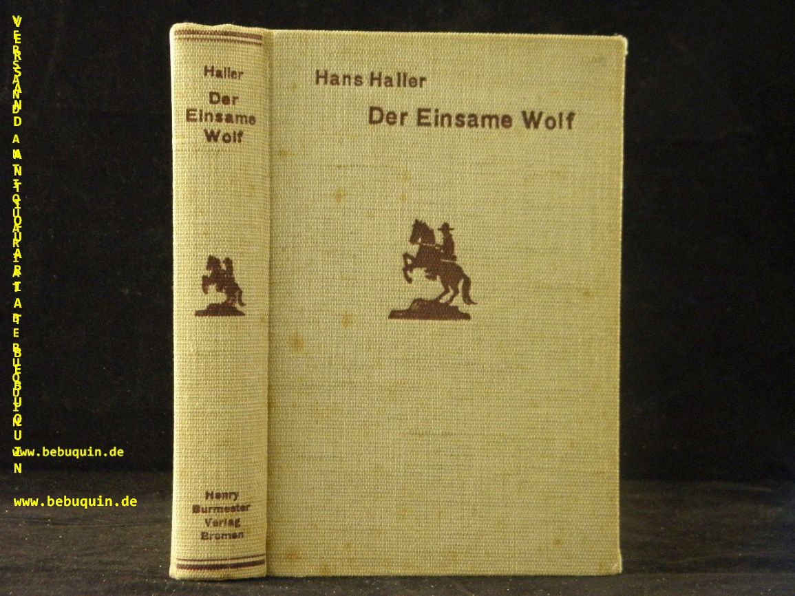 HALLER, Hans: Der einsame Wolf. Bremen (Burmester), (1934). 256 S. ill. OLn. vereinzelte Stockflecken, schönes Ex. = Burmester’s Abenteuer – Serie. EA. Schegk / Wimmer S2.