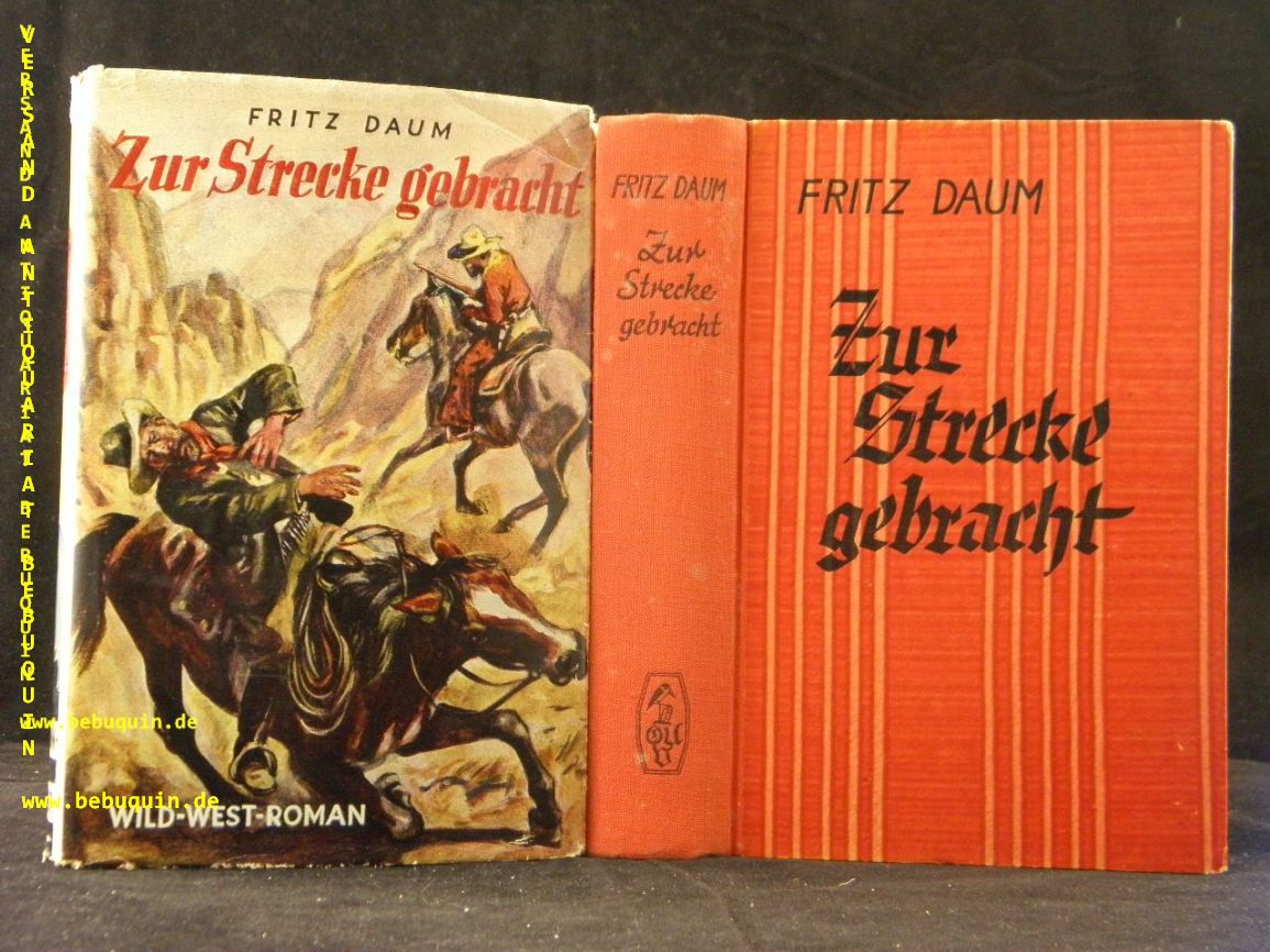 DAUM, Fritz: Zur Strecke gebracht. Wild-West-Roman. Berlin (Uhlmann), ca 1938. 309 (3) S. ill. OLn. mit OUmschl. Umschlag mit kleinen hinterlegten Einrissen, sehr gutes Ex = Uhlmann – Bücher. EA.