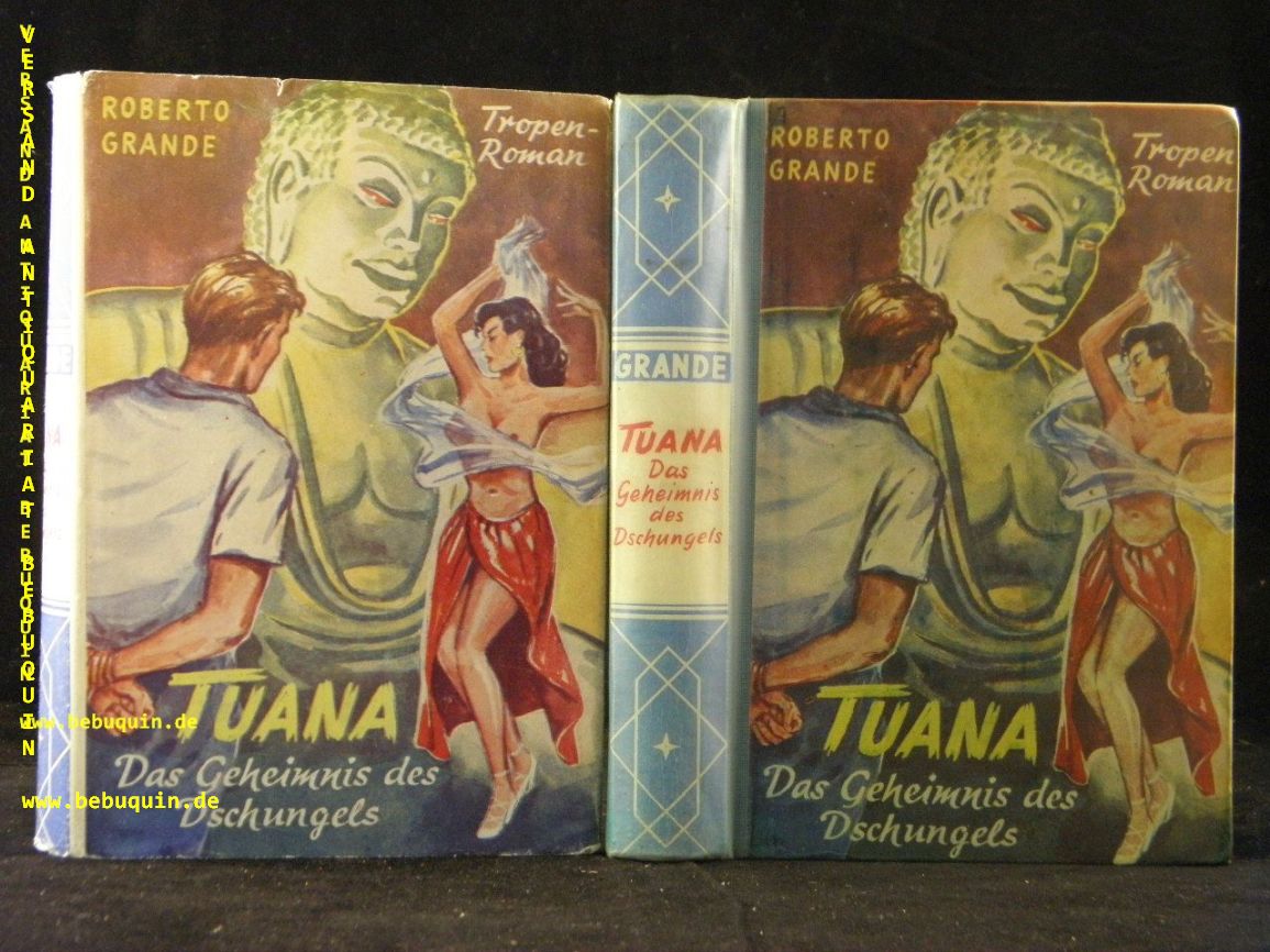 GRANDE, Roberto: Tuana das Dschungelgeheimnis. Tropen-Roman. Kaiserslautern (Schäfer), 1953. 270 S. farb. ill. OHLn mit OUmschl. gestempeltes Leihbuch. EA. Indiziertes Leihbuch 1955!