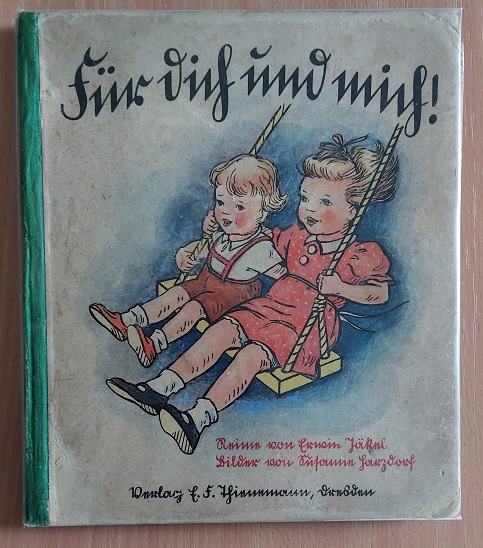 JÄKEL, Erwin: Für dich und mich! Dresden (C.F. Thienemann), 1941. Gr. 8°. 8 farb. ill. Bildseiten von Susanne Harzdorf auf unzerreißbaren Pappseiten. farb. ill. OHLn. teils bestaubt, Gelenke nachgeleimt, sonst ordentlich. seltene EA (Klotz 3072/1).