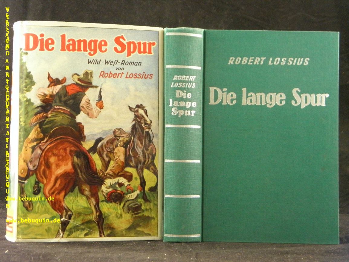 LOSSIUS, Robert: Die lange Spur. Wild-West-Roman. Dresden (Münchmeyer), ca 1935. 308 S. OLn mit Silberprägung und OUmschl. Umschlag mit wenigen kleinen Einrissen, schönes Ex. = Münchmeyers Abenteuerromane. EA.