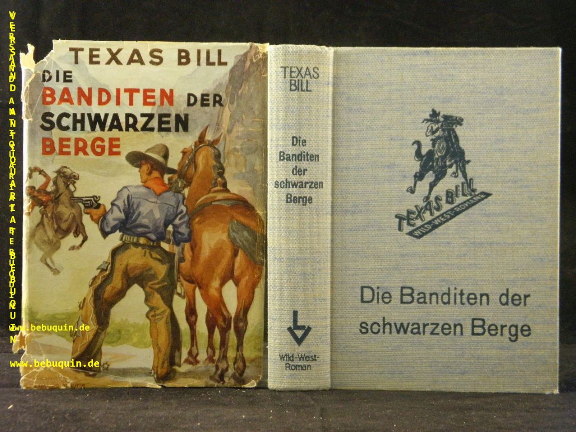 TEXAS BILL.– SCHUBERT, Paul H.: Die Banditen der schwarzen Berge. Wild-West-Roman. Leipzig (Lipsia), 1939. 271 S. ill. OLn mit OUmschl. Umschlag am Rand lädiert, das Buch tadellos. EA.