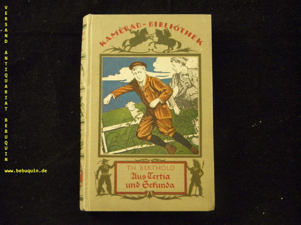 KAMERAD-BIBLIOTHEK. BERTHOLD, Theodor: Aus Tertia und Sekunda. Lustige Schülergeschichten. 30. Aufl. Stuttgart (Union), 1929. kl.8°. 303 S. mit zahlr. Bildern. + Werbenanhang. ill. OLn mit mont. Farbbild. feines Ex. = Bd. 15. Klotz 448/4.