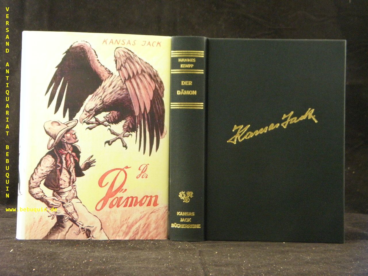 KANSAS JACK.– KEMPP, Hannes: Der Dämon. Wild-West-Roman. Reprint derAusgabe: Leipzig (Dietsch), 1939. 280 S. mit Textabb. schwarzes OLn mit goldgeprägter Signatur und OUmschl. neuwertig. = Kansas Jack – Bücherreihe, Bd. 2. sehr seltener Reprint des im Original unauffindbaren Titels.
