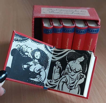 ARETINO, Pietro: Die Gespräche. 6 Bände. Leipzig (Andersen Nexö), 1980. 5,5 x 5,5 cm. 213 + 207 + 232 + 326 + 298 + 317 S. mit Illustrationen von Werner Klemke (Vor- und Nachsatz, sowie Kassettenbezug). OLdr. in OSchuber. Als Manuskriptvorlage diente der im Dr. Sally Rabinowitz Verlag 1921 erschienene Privatdruck, – – intern89-3112 Deutsch –