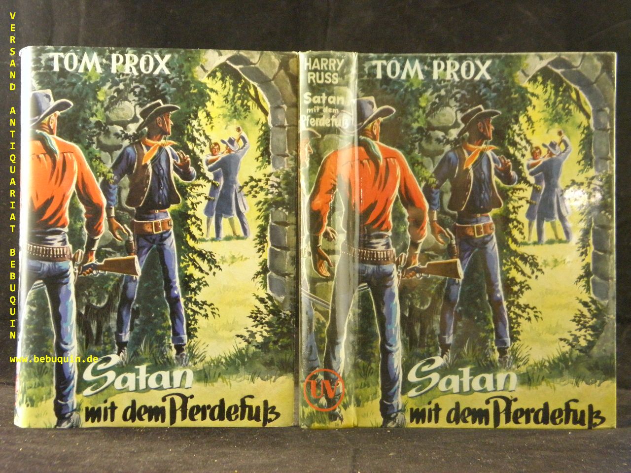 TOM PROX.– RUSS, Harry: Satan mit dem Pferdefuß. Bad Godesberg (Uta), 1958. 256 S. farb. ill. OPb. mit OUmschl. gestempeltes Leihbuch. = Tom Prox abenteuerliche Erlebnisse, Bd. 146. 1. Aufl. dieser Ausgabe.