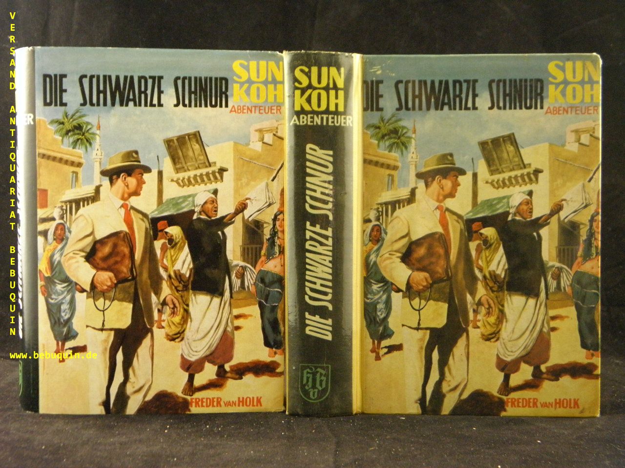 SUN KOH.– HOLK, Freder van: Die schwarze Schnur. Abenteuer-Roman. Münster (Borgsmüller), ca 1960. 262 (2) S. farb. ill. OHLn. mit OUmschl. gestempeltes Leihbuch. 1. Aufl. dieser Ausgabe.