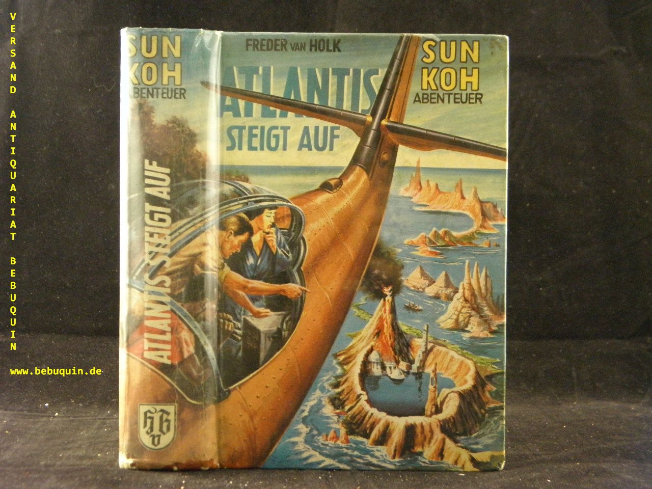 SUN KOH.– HOLK, Freder van: Atlantis steigt auf. Abenteuer-Roman. Münster (Borgsmüller), ca 1960. 246 (6) S. farb. ill. OHLn. mit OUmschl. gestempeltes Leihbuch. 1. Aufl. dieser Ausgabe.