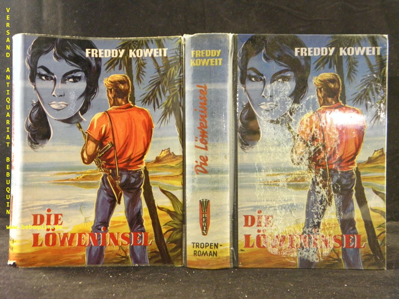 KOWEIT, Freddy: Die Löweninsel. Tropenroman. Menden (Bewin), 1957. 255 S. farb. ill. OHLn mit OUmschl. Vorderdeckel mit leichtem Abklatsch. feines Ex. EA mit dem Original Verlagslesezeichen inliegend.