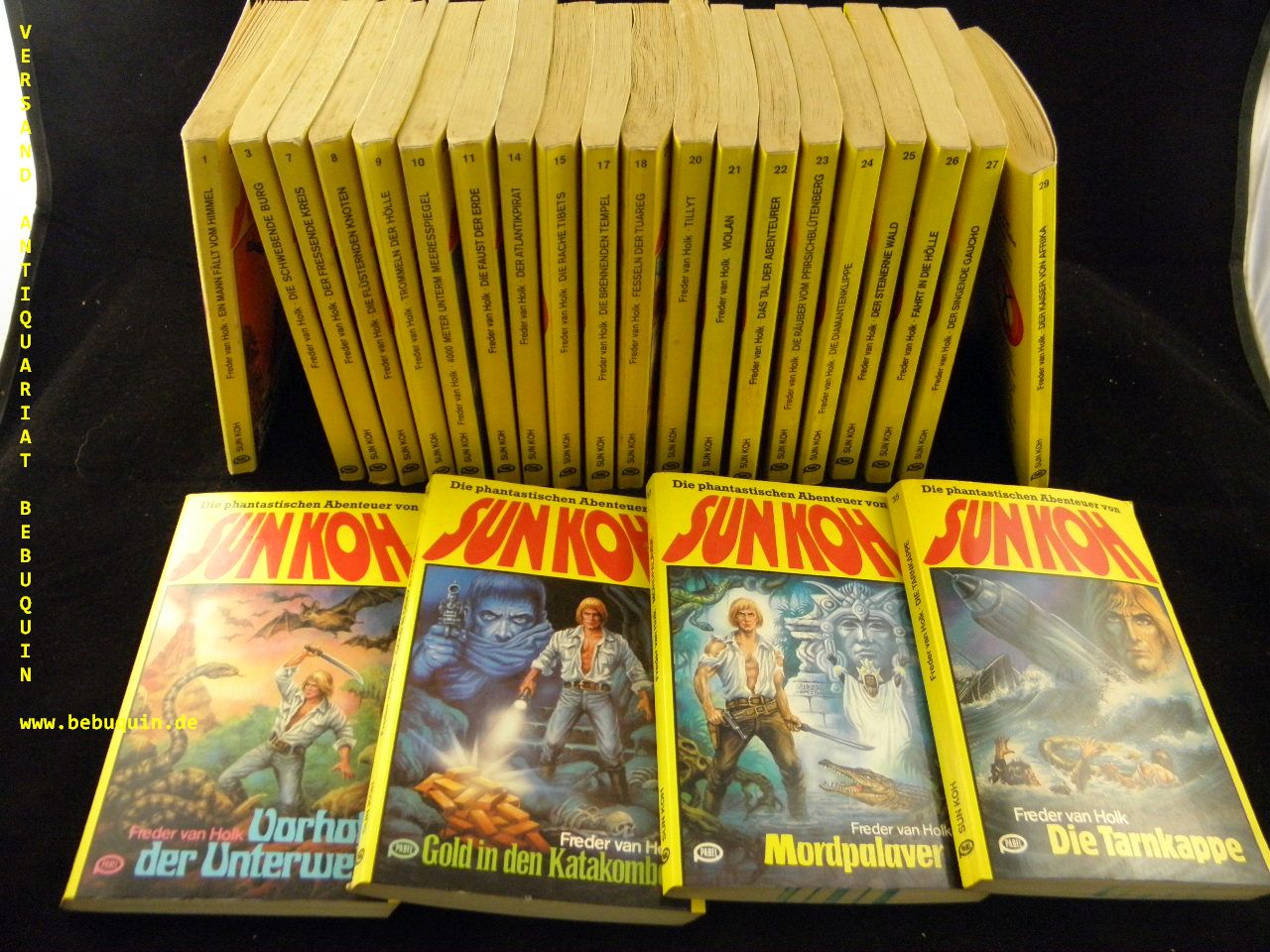 SUN KOH.– HOLK, Freder van: Die phantastischen Abenteuer von Sun Koh. 24 (von 37) Bände der Reihe: Vorhanden sind die Nummern 1,3,7-11,14,15,17,18,20-29,31-33-35. Rastatt (Pabel), 1978. jeweils ca 150 S. farb. ill. OKart. gutes Ex. 1. Aufl. dieser Ausgabe.