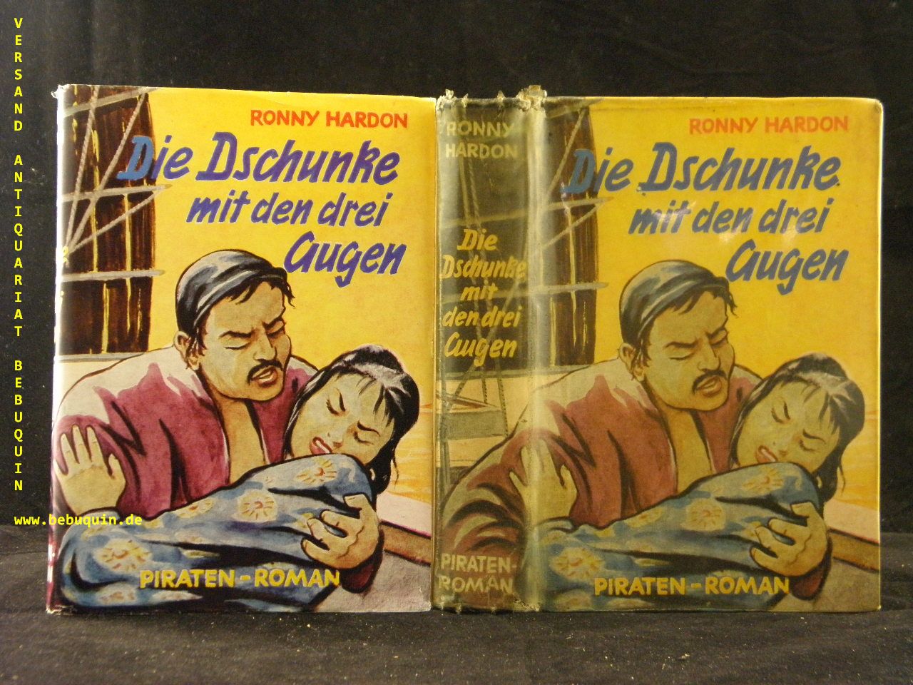 HARDON, Ronny: Die Dschunke mit den drei Augen. Piratenroman. Kaiserslautern (Skorpion), ca 1955. 256 S. farb. ill. OSupronyl mit OUmschl. gestempeltes Leihbuch. EA. Indiziertes Leihbuch *1957!