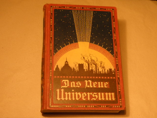 DAS NEUE UNIVERSUM.– Die interessantesten Erfindungen und Entdeckungen auf allen Gebieten, sowie Reiseschilderungen, Erzählungen, Jagden und Abenteuer. Stuttgart (Union), (1914). VI, 473 S. mit sehr zahlr. z.T. farb. Abb. im Text + auf Tafeln. ill. OLn. Titelbild mit Durchriss, sonst schönes Ex. = Bd 35. Das Neue Universum war eine Jugendbuchreihe. Ab 1880 erschien jährlich ein Band mit Themen aus den Bereichen Wissen, Forschung, Abenteuer, Unterhaltung. In den Jahren 1943 sowie 1945 bis 1947 wurden keine Bände veröffentlicht. 1958 erschien der Jubiläumsband 75. Im Jahr 2002 erschien nach 122 Jahren der letzte Band mit Nummer 119. Die Bände 1 bis 11 erschienen im W. Spemann Verlag, Stuttgart; die Bände 12 bis 90 im Union Verlag Deutsche Verlagsgesellschaft, Stuttgart-Berlin-Leipzig; die Bände 91 bis 119 im Südwest-Verlag, München. Außer Sachthemen druckte das Neue Universum auch fiktionale Texte. Bekannte Autoren wie Isaac Asimov und Hans Dominik und viele andere veröffentlichten so ihre Science-Fiction-Kurzgeschichten im Neuen Universum. Dabei zeichnen sich Themenwahl und inhaltliche Gestaltung durch einen starken Zukunfts-, Wissenschafts- und Machbarkeitsoptimismus aus. In den Jugendstilbänden hieß es im Untertitel: Ein Jahrbuch für Haus und Familie, besonders für die reifere Jugend, mit einem Anhang zur Selbstbeschäftigung „häusliche Werkstatt“. Später lautete der Untertitel des Jahrbuches „Ein Jahrbuch des Wissens und Fortschritts“, ab 1970 wurde es umbenannt in „Forschung, Wissen, Unterhaltung. Ein Jahrbuch“, ab 1985 hieß es „Ein Jahrbuch für Forschung, Wissen, Unterhaltung“. (Wikepedia)