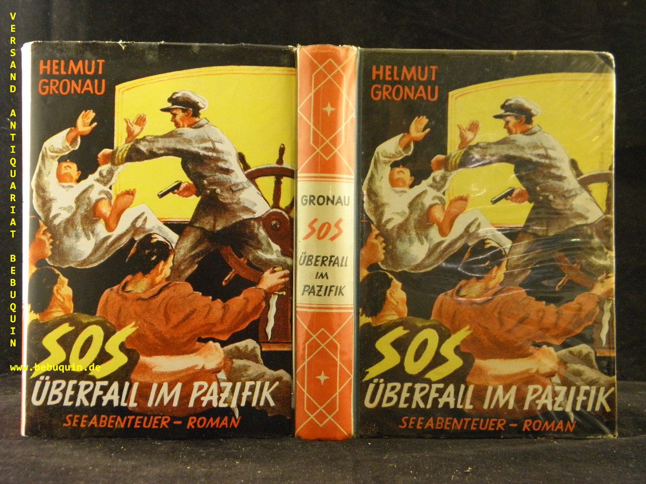 GRONAU, Helmut: SOS . . . Überfall im Pazifik. Seeabenteuer-Roman. Kaiserslautern (Schäfer), 1953. 255 S. farb. ill. OHLn mit OUmschl. Krickel auf Vorsatz. EA.
