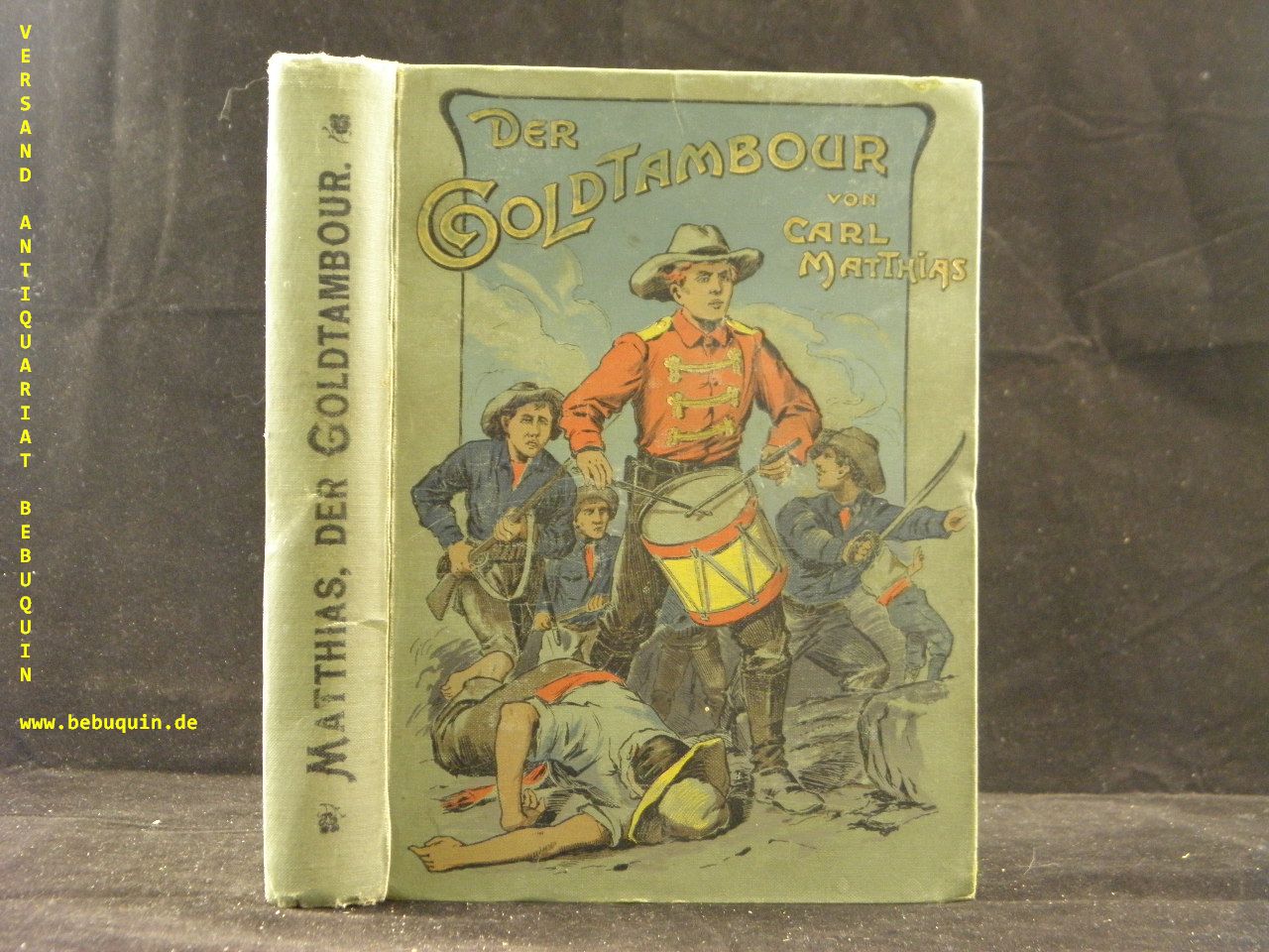 KOLONIEN.– MATTHIAS, Carl: Der Goldtambour. Eine Erzählung für die reifere Jugend. 2. Aufl. Stuttgart (Levy & Müller), ca 1910. Gr. 8°. 280 (2) S. mit 4 Autotypien nach Originalen von Walther Zweigle. farb. ill. OLn. Vorsätze erneuert und Frontispiz durch Kopie ersetzt, sonst gut erhalten. Klotz 4477/6.