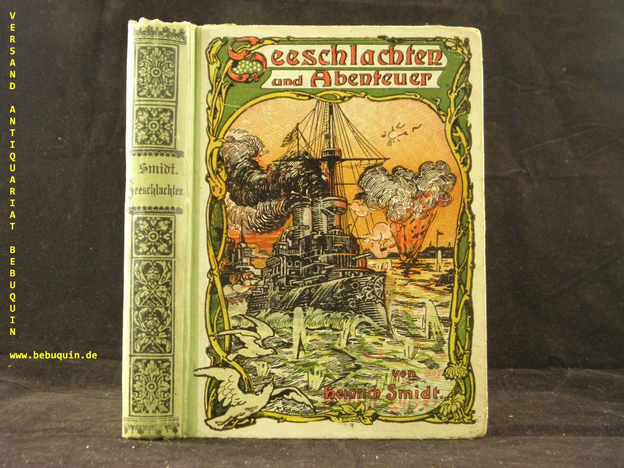 SMIDT, Heinrich: Seeschlachten und Abenteuer berühmter Seehelden. Mit einem Anhang: Bilder aus dem Chinesisch-Japanischen und dem Amerikanisch-Spanischen Kriege. Berlin (Gahl), (1902). 240 S. mit 5 (3 farblithografischen) Bildtafeln. farb. ill. OHLn. Kanten leicht berieben, gutes Ex. 1. Aufl. dieser Ausgabe. Kotz 6368/38.