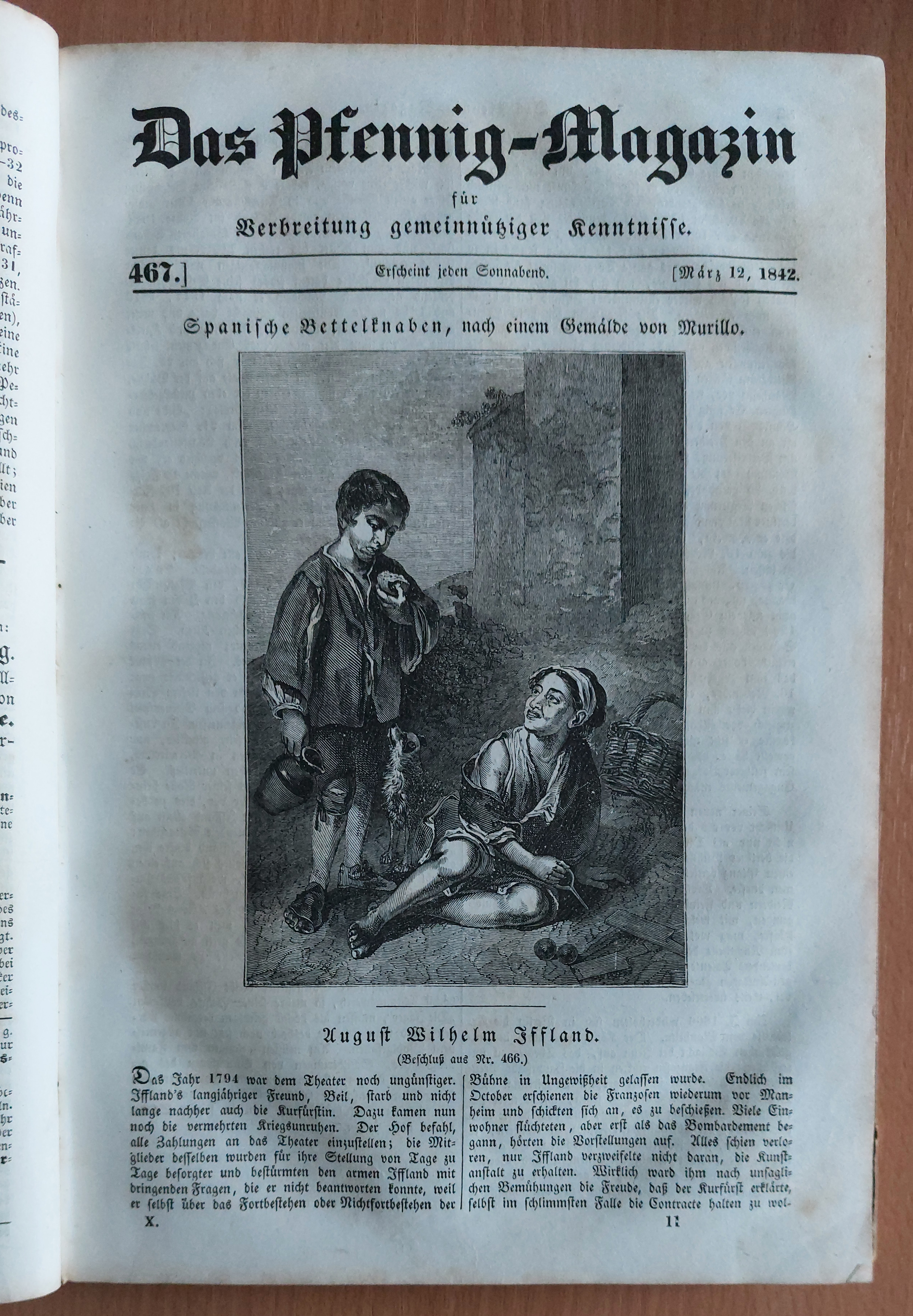 DAS PFENNIG-MAGAZIN.– der Gesellschaft zur Verbreitung gemeinnütziger Kenntnisse. 10. Bd. Nr. 457 – 509. Leipzig (Brockhaus), 1842. 4°. VII, 424 S. mit zahlr. Abb. Pb der Zeit. Kanten angeplatzt, Papier nur wenig stockfleckig. Enthält u.a. Beiträge über: Gellert – Landreise von Indien nach Europa – Eine Londoner Bierbrauerei – Basedow – Reise nach Surinam – Lord Byron – Iffland – Erdbeben und andere Naturerscheinungen im Jahre 1841 – Fichte – Das Haus des Malers Rubens in Antwerpen – Franz Liszt – Landreise von England nach Indien – Chronik der Eisenbahnen im Jahre 1841 – Maria Theresia – Die Bewässerung im Morgenlande – Paul Gerhard – Das britische Guiana – Die Ministerien der größern europäischen Staaten am 1. Mai 1842 – Bunte Bilder aus Petersburg – Die Finsternisse – Neueste Fortschritte der Daguerreotypie – Worms – Die alten Phönizier – Utrecht – Das Planetensystem – Karthago – Peking – Die Donau – Norwegen und die Norweger – Die Gletscher der Schweiz – Halley – Skizzen aus Moskau – Michelangelo – Goldsmith – Die Tabacksfabrikation – Die Letten und Esten – Die Insel Haiti – Südrussische Reisewagen – Mekka – Zur Kenntniß altenglischer Lebensweise – Das Feuerland und seine Bewohner – Der Berg Karmel – Wichtige Erweiterung der Photographie – Die brasilianischen Indianer – Expedition der Franzosen gegen Tagdempt – Georg Washington – Neapolitanische Räuber.