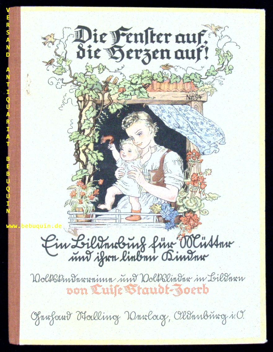 STAUDT-ZOERB, Luise: Die Fenster auf, die Herzen auf! Ein Bilderbuch für Mütter und ihre lieben Kinder. Volkskinderreime und Volkslieder in Bildern. Für das deutsche Frauenwerk hrsg. Oldenburg (Stalling), 1936. 4°. 8 Bl. mit farb. Titelbild und 15 Farbill. farb. ill. OHLn. leicht angeschmutzt, NaT EA. Trotz aller doktrinären Manipulation haben sich die Nationalsozialisten mit ihren Forderungen gegen den breiten Strom traditioneller Klischees auf dem Sektor des Bilderbuchs nicht immmer durchsetzen können. Doderer/Müller S. 348.