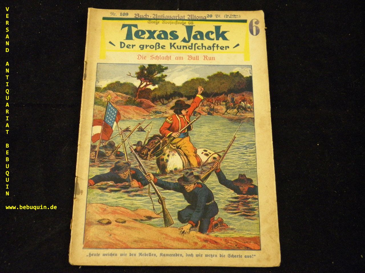 TEXAS JACK DER GROSSE KUNDSCHAFTER.– Nr. 109. Die Schlacht um Bull Run. Berlin (Volksliteratur), 1930. 32 S. farb. ill. OBr gestempelt und gebräunt. seltenes Romanheft.