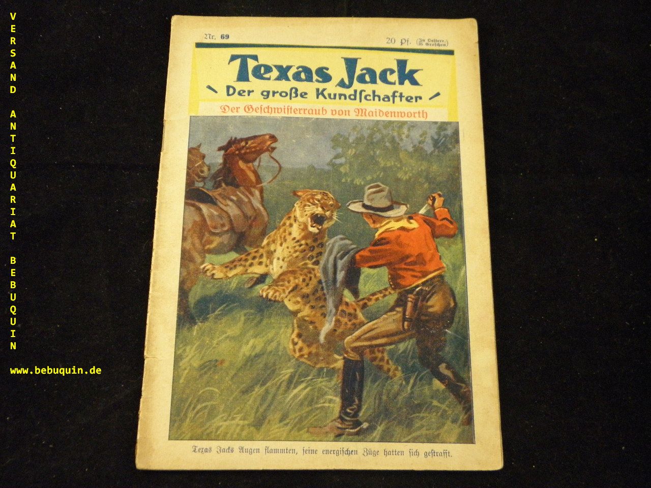 TEXAS JACK DER GROSSE KUNDSCHAFTER.– Nr. 69. Der Geschwisterraub von Maidenworth. Berlin (Volksliteratur), 1930. 32 S. farb. ill. OBr gebräunt. seltenes Romanheft.
