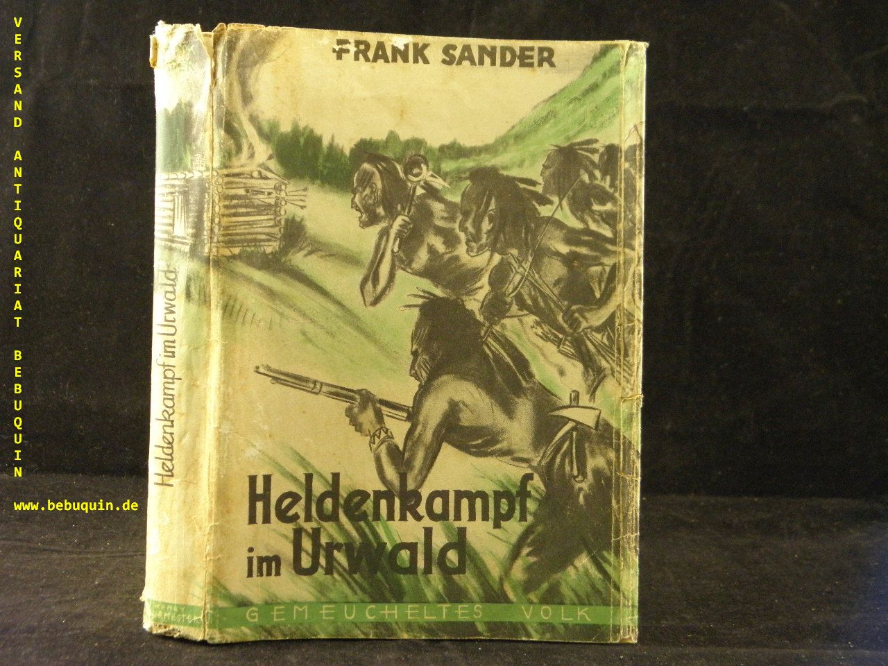 SANDER, Frank: Heldenkampf im Urwald. Dritter Band der Romanfolge „Gemeucheltes Volk“ aus der Geschichte des Untergangs der Indianer Nordamnerikas. Bremen (Henry Burmester), (1934). 246 S. + 1 Karte. schlichter OKart mit OUmschl. Umschlag etwas lädiert, NaV. EA Schegk / Wimmer S3. Frank Sander hieß in Wirklichkeit Otto Neitsch und war Berliner Senator. Geboren 1892 in Eckernförde, Vater dreier Söhne und gestorben 1941 in Berlin.