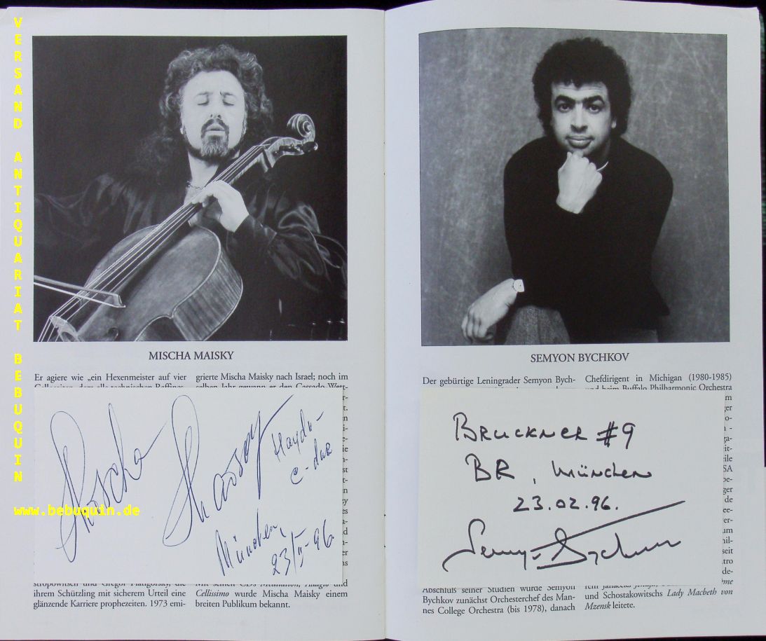 MAISKY, Mischa (Cellist) + BYCHKOV, Semyon (Dirigent): 2 eigenhändig signierte und datierte Autogrammkarten. Mit dem Symphonieorchester des Bayrischen Rundfunks. München (Philharmonie), 23.2.1996. zwei Karteikarten in Original Programmheft. ill. OKart. mit 2 Eintrittskarten inliegend. tadellos. Mischa Maisky (* 10. Januar 1948 in Riga, Sowjetunion, heute Lettland) ist ein klassischer Cellist und gilt als einer der besten Cellisten der Gegenwart. Er lebt heute in Waterloo bei Brüssel.