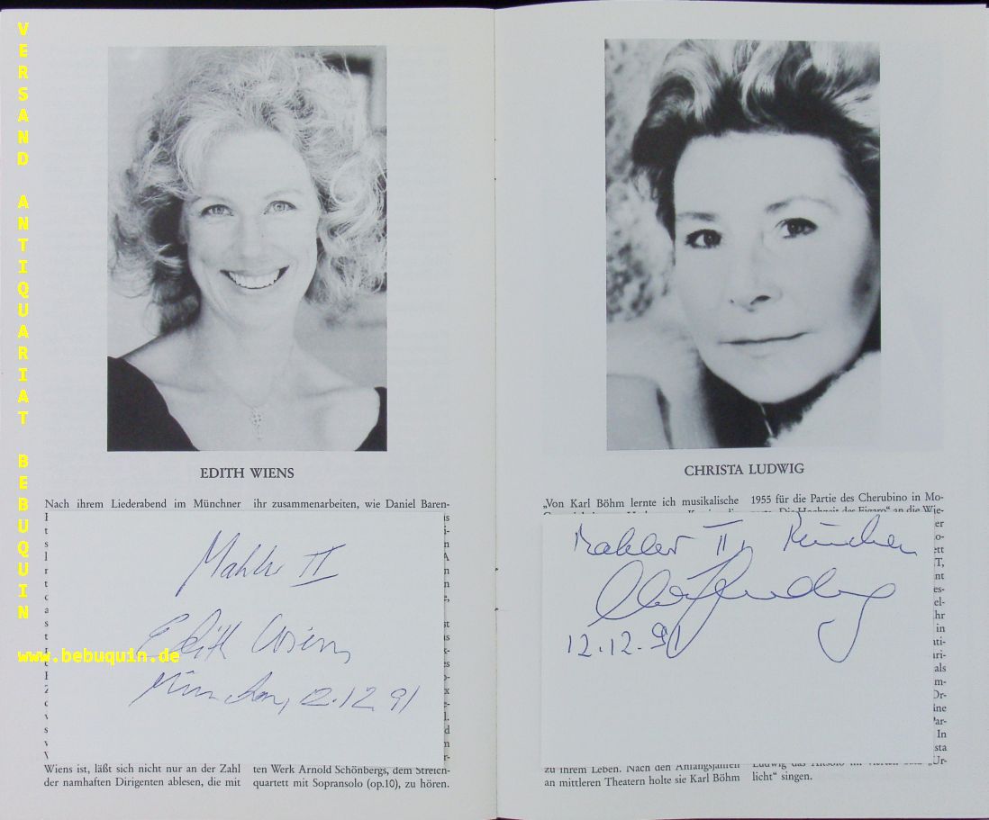 WIENS, Edith (Sopran) + LUDWIG, Christa (Alt) + BYCHKOV, Semyon (Dirigent): 3 eigenhändig signierte und datierte Autogrammkarten der Mitwirkenden. Mit dem Symphonieorchester des BR. München (Philharmonie), 12.12.1991. 8 x 12,5 cm. 3 Karteikarten im Original Programmheft, diese 16 S. mit zahlr. Abb. OKart mit 2 Eintrittskarten beiliegend. gutes Ex.