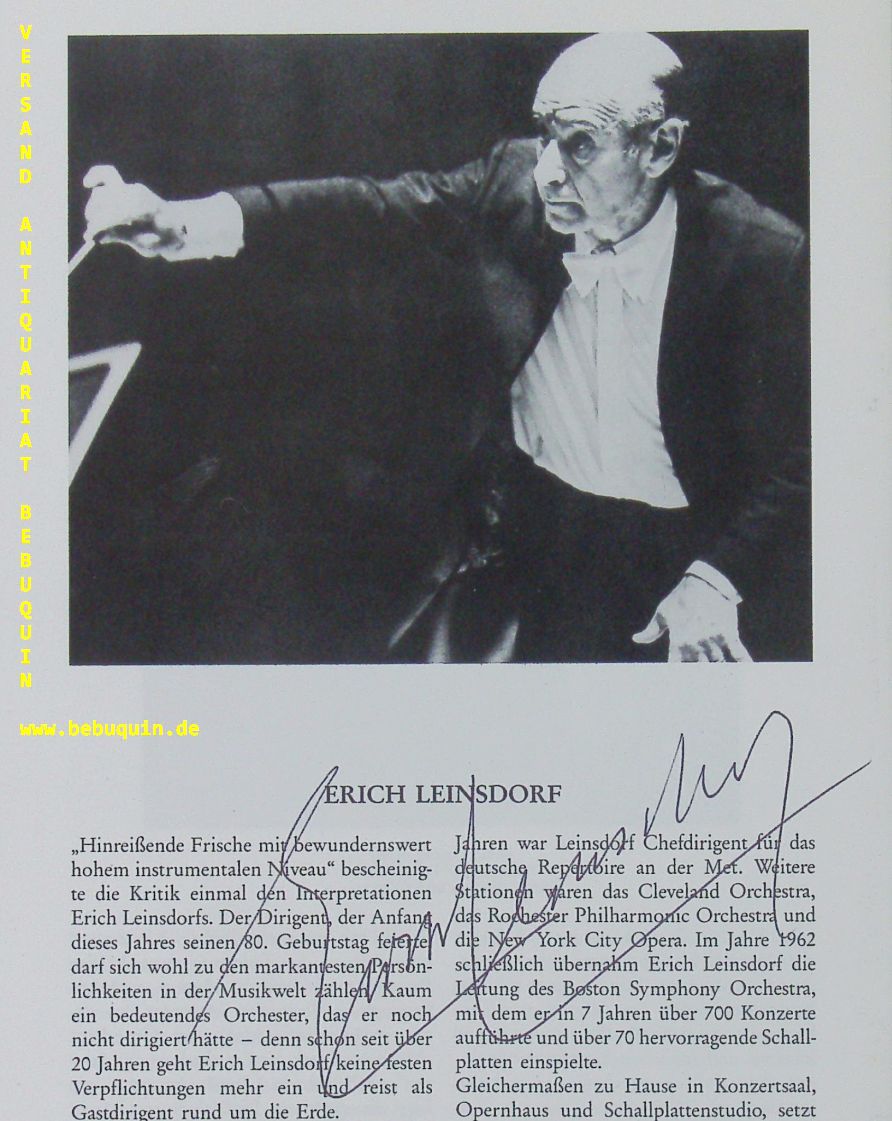 LEINSDORF, Erich (Dirigent): Programmheft mit der eigenhändigen Signatur des Dirigenten neben seinem Bild. Mit dem Symphonieorchester des BR. München (Philharmonie), 9.7.1992. Gr. 8°. 16 S. mit zahlr. Abb. + 2 Eintrittskarten beiliegend. OKart. Bindung etwas gelockert. Erich Leinsdorf, geborener Erich Landauer (* 4. Februar 1912 in Wien; † 11. September 1993 in Zürich) war ein österreichisch-US-amerikanischer Dirigent, der ab 1937 vorwiegend in den Vereinigten Staaten lebte. Leinsdorf galt als typischer Operndirigent und wurde in Amerika besonders als Wagner-Dirigent geschätzt.