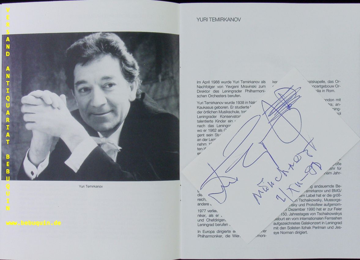 TEMIRKANOV, Yuri (Dirigent): eigenhändig datierte und signierte Autogrammkarte. Mit den St. Petersburger Philharmonikern. München (Philharmonie), 2.12.1991. 8 x12,5 cm. Karteikarte in Programmheft. 12 S. mit zahl. Abb. OKart. tadellos = Münchner Konzertdirektion Hörtnagel. Juri Chatujewitsch Temirkanow (* 10. Dezember 1938 in Naltschik, damals Kabardino-Balkarische Autonome Sozialistische Sowjetrepublik, Sowjetunion) ist ein russischer Dirigent. Er wurde in eine Familie geboren, die der Volksgruppe der Kabardiner angehört. Sein Studium in den Fächern Viola und Dirigieren absolvierte er am Sankt Petersburger Konservatorium, an dem er durch Ilja Musin zum Dirigenten ausgebildet wurde. Yuri Temirkanov ist seit 1988 Künstlerischer Direktor und Chefdirigent der Sankt Petersburger Philharmoniker.. (Wikipedia)