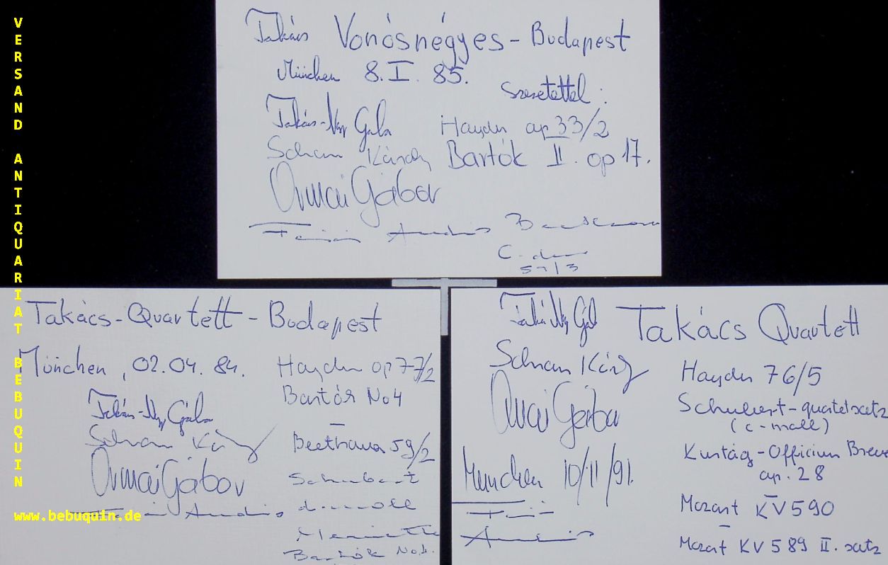 TAKACS QUARTETT.– TAKASC-NAGY, Gabor + SCHRANZ, Karoly + ORMAI, Gabor + FEJER, Andras: 3 eigenhändig von allen vier Künstlern signierte und datierte Autogrammkarte. München (Philharmonie), 2.4.1984 – 10.11.1991. 8 x 12,5 cm. 3 Karteikarten. tadellos The Takács Quartet is a string quartet, founded in Hungary, and now based in Boulder, Colorado, United States. (Wikipedia)