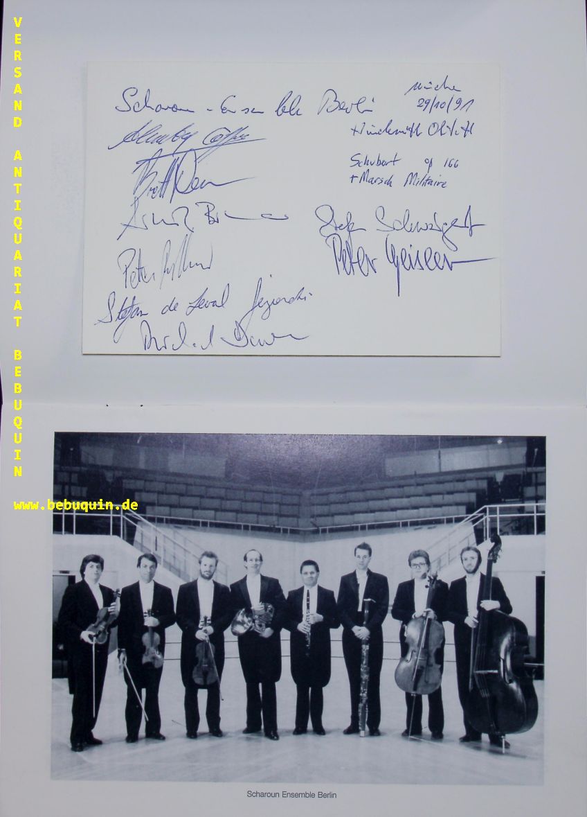 SCHAROUN ENSEMBLE BERLIN: da sind: Alexander Cappone, Armin Brunner, Brett Dean, Riuchard Duven, Peter Riegelbauer, Peter Geisler, Stefan Schweigert, Steafn Jazierski: eigenhändig datierte und von allen Mitgliedern signierte Autogrammkarte. München (Herkulessaal), 10.3.1992. 10,5 x 14,5 cm. große Karteikarte in Programmheft. 12 S. mit zahl. Abb. OKart. tadellos Das 1983 von Mitgliedern der Berliner Philharmoniker gegründete Scharoun Ensemble gehört zu den profiliertesten Kammermusikformationen Deutschlands. (Selbstdarstellung)